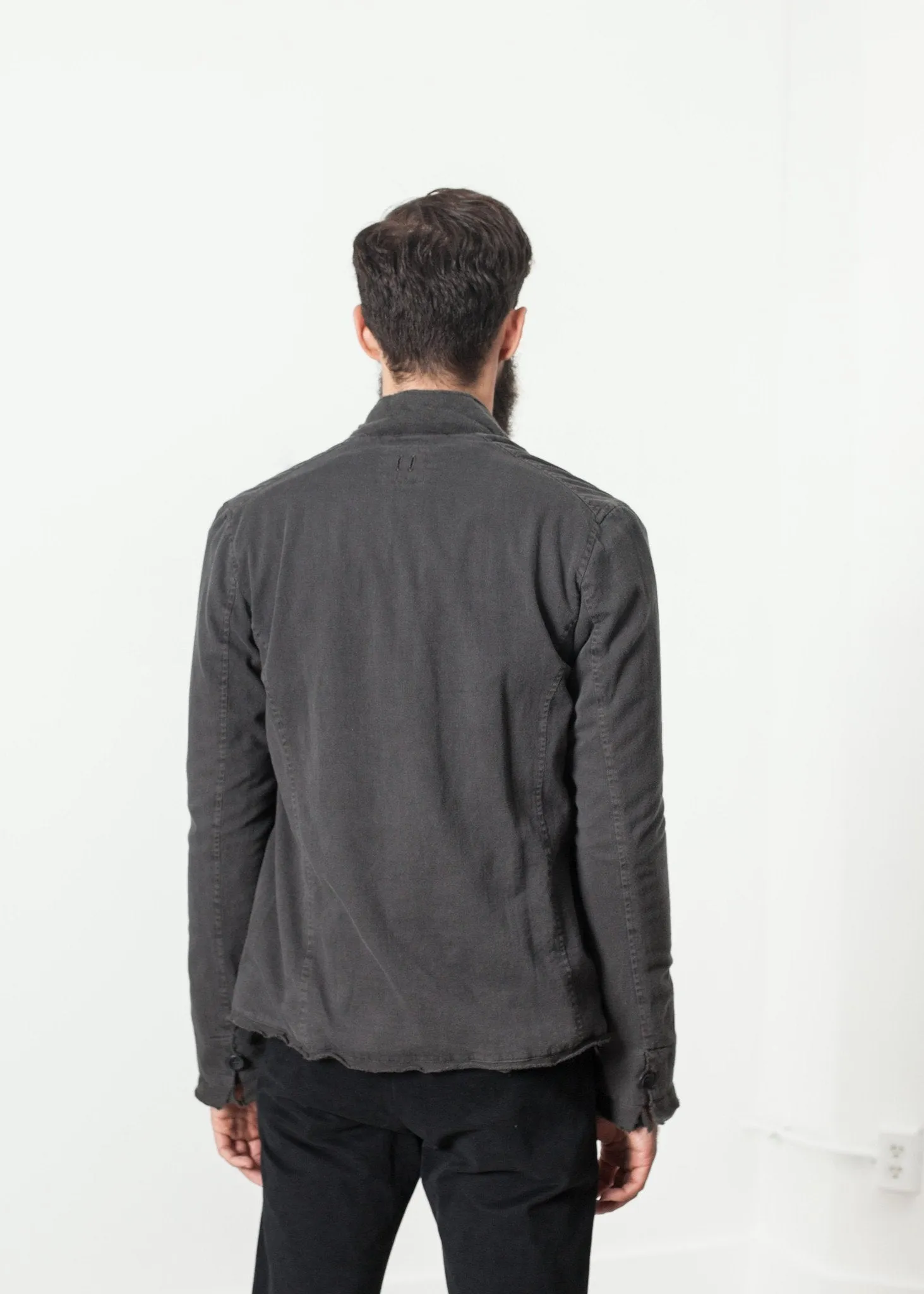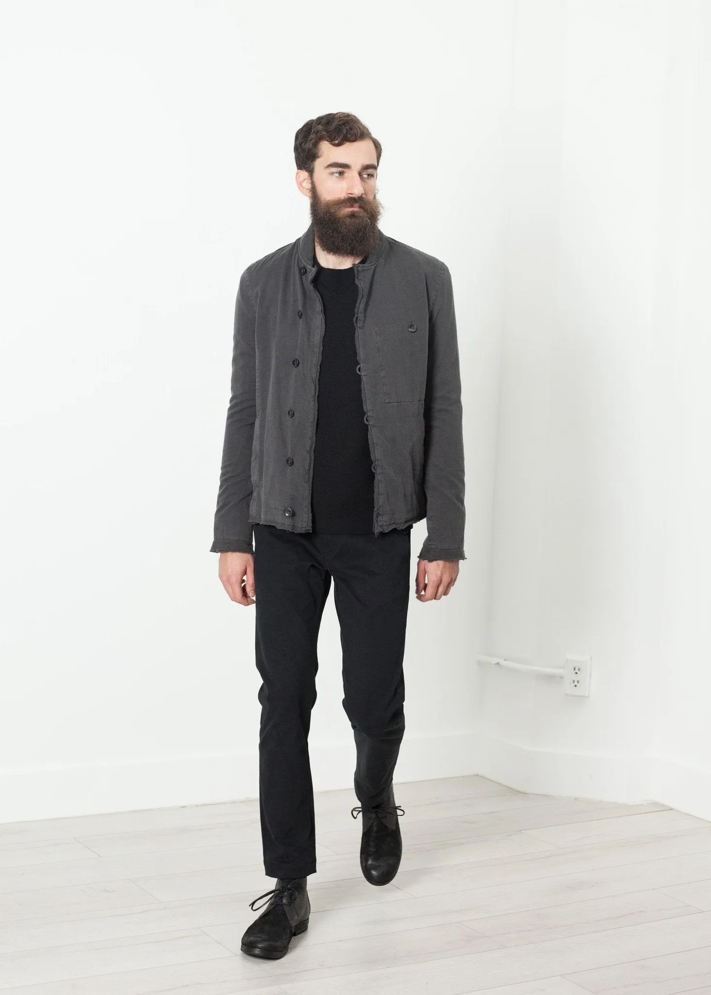 Understated yet classic, Hannes Roether’s pieces offer versatility through timeless silhouette. Woven jacket with unfinished hems. Standing collar. Hidden interior breast pocket. Fully lined. Color Tar. 100% Cotton. Made in Czech Republic. Addis is wearing a size Medium. Addis is 6’2”, Chest 38.5”, Waist 31”, Inseam 32”