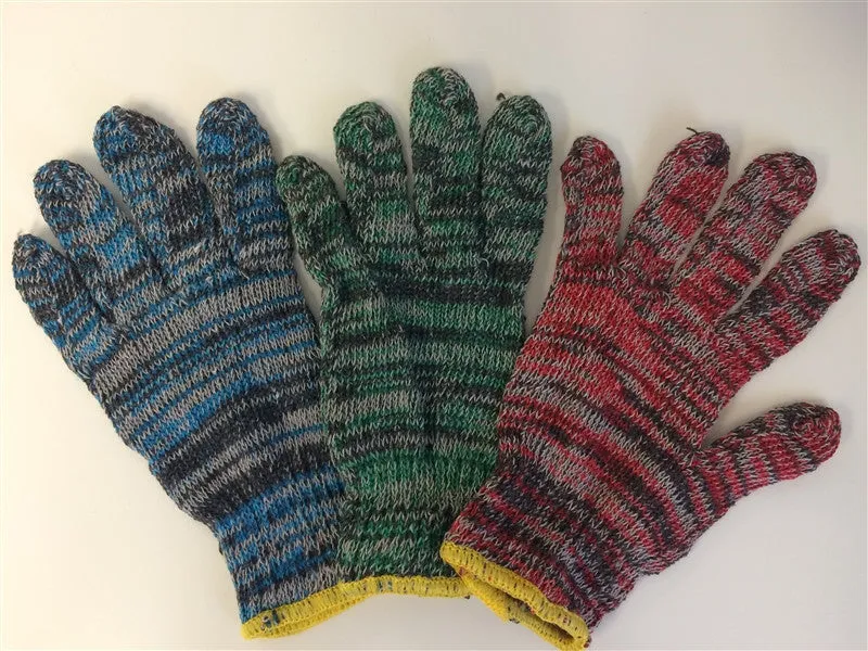 These multi color knit gloves are low cost and very popular Made of 60% cotton/ 40% polyester Very suitable for a variety of uses and are ideal as a liner under work gloves Their seamless design provides warmth and reduces abrasion.