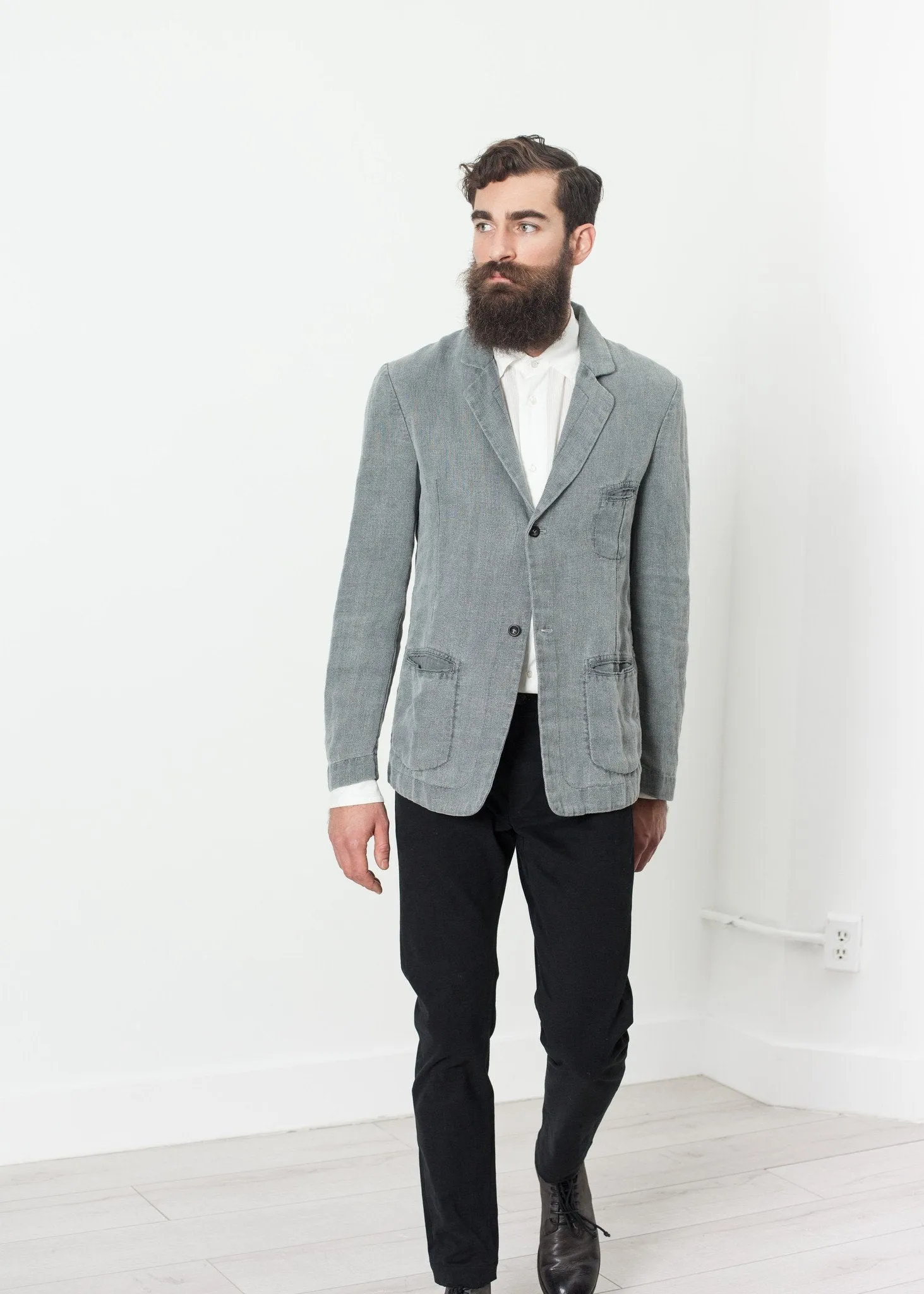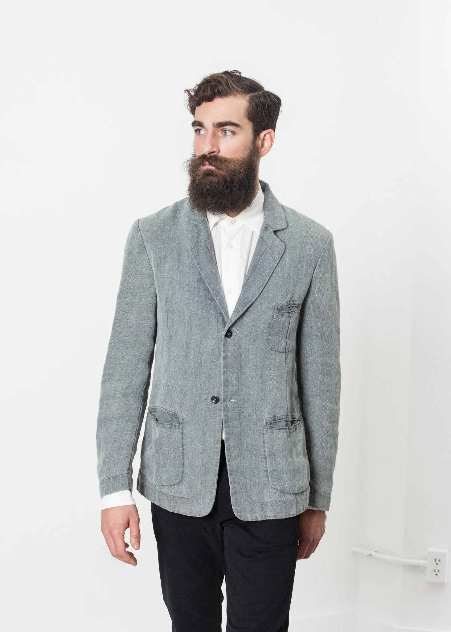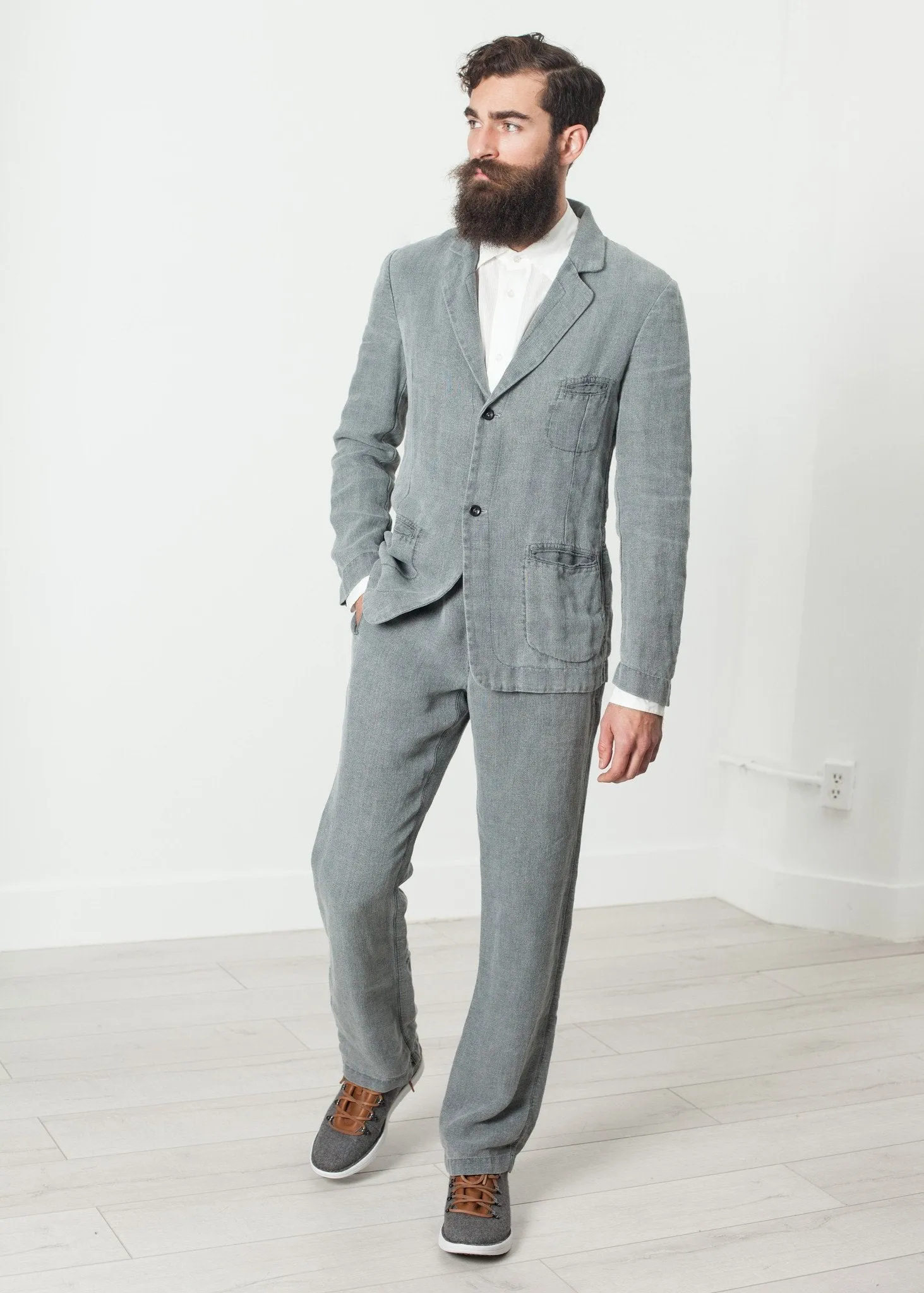 Understated yet classic, Hannes Roether’s pieces offer versatility through timeless silhouette. Woven jacket with yoke detail. Accent lapels. Hidden interior breast pocket. Color Tar. 100% Linen. Made in Czech Republic. Addis is wearing a size Small. Addis is 6’2”, Chest 38.5”, Waist 31”, Inseam 32”.